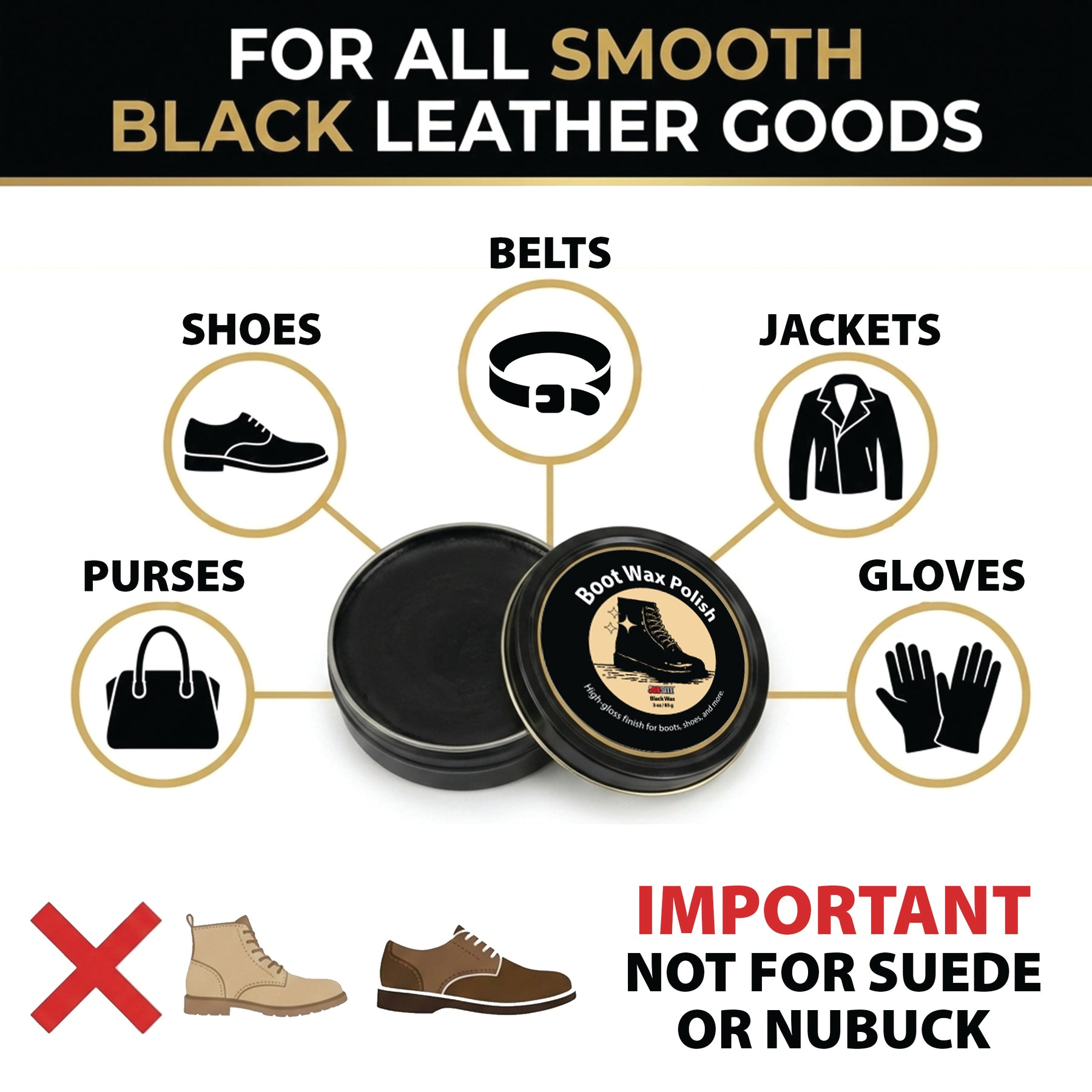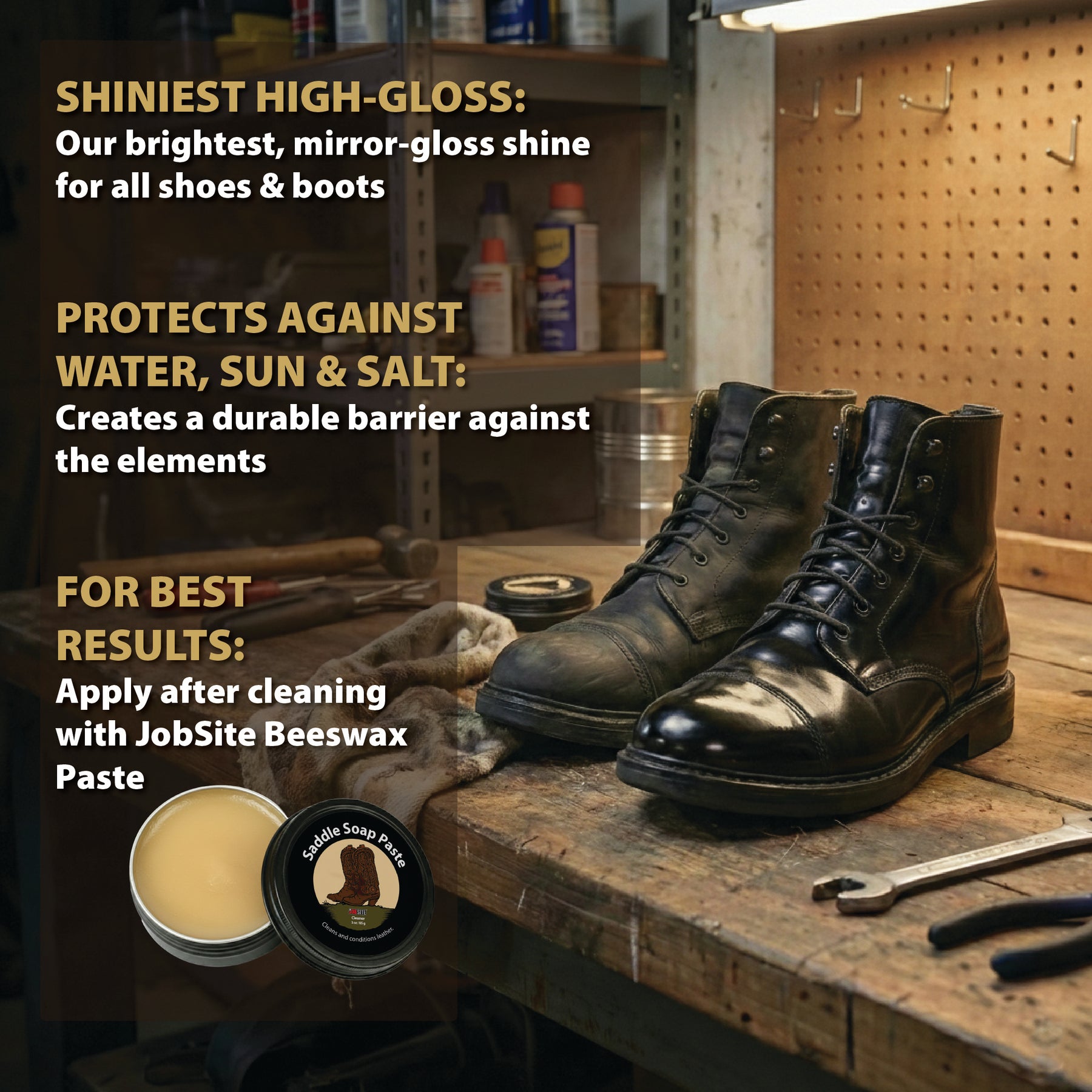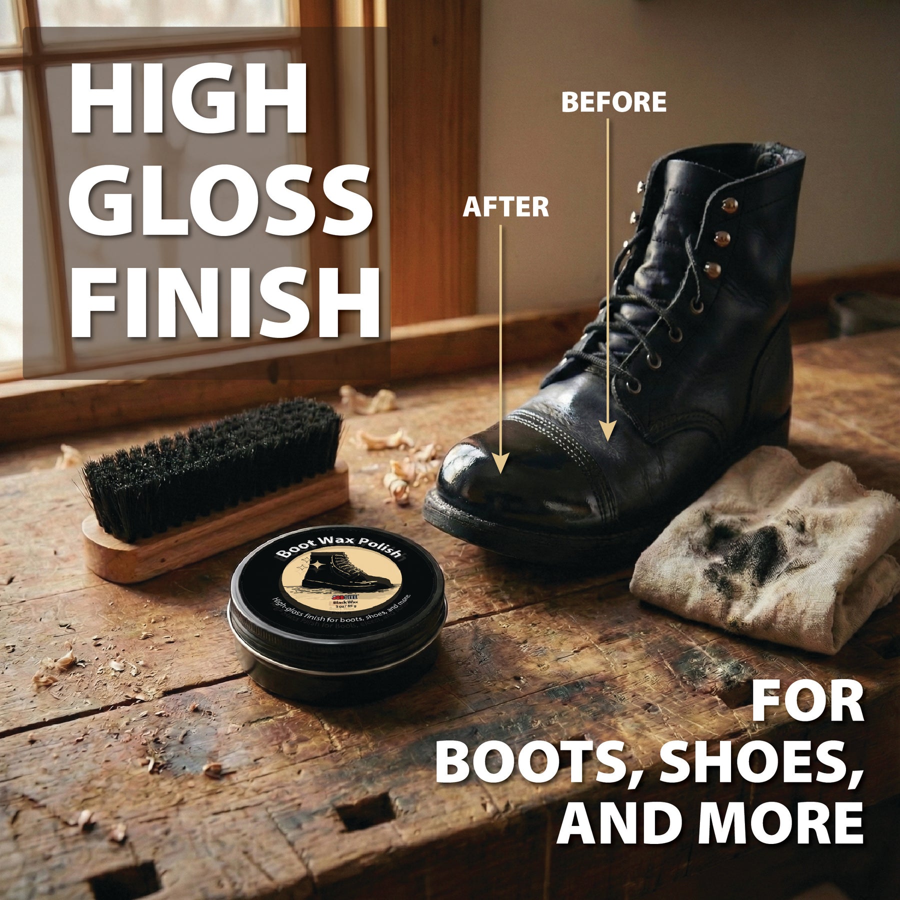 Introducing the JobSite Black Boot Polish Wax - the ultimate solution for achieving a high gloss finish and a mirror-like shine on your footwear. This premium, professional grade black shoe polish polishes to restore the natural beauty of your leather shoes and boots while providing waterproofing protection. Our shoe polish is not only a conditioner paste to enhance the appearance of your footwear but is also a protector against the elements, making it a trusted choice for cobblers and shoe enthusiasts alike. We understand the importance of renovating your footwear, and our Shoe Polish Wax ensures that your leather shoes and boots remain in pristine condition. The rich satin and bold color of our black dye dressing balm effectively repair scuff & scratches, preventing dullness and reviving cracked and dried-out leather. This high-shine polish grease dries quickly, allowing you to achieve that military shine and spit shine look. Perfect for dress boots, work boots, and refreshing old footwear, this polish offers a cost-effective alternative to buying new footwear. Our Boot Polish Wax is more than just a black shoe polish; it's a comprehensive leather care solution. It acts as a water-resistant and waterproof spray for shoes and boots, ensuring your footwear is protected against rain and moisture. JobSite's Boot Polish Wax is a must-have in your shoe care arsenal. For those who appreciate leather shoe polish that delivers both high gloss and durability, our product stands out as a top choice. Packaged conveniently in a 3 oz container, this product is easy to travel with and store. The JobSite Boot Polish Wax is perfect for those who demand excellence in their shoe care routine, offering a bright shiner that is sure to impress. Trust JobSite for a shoe polish that combines quality, performance, and protection. Elevate your shoe care regimen today and experience the difference with JobSite Boot Polish Wax.