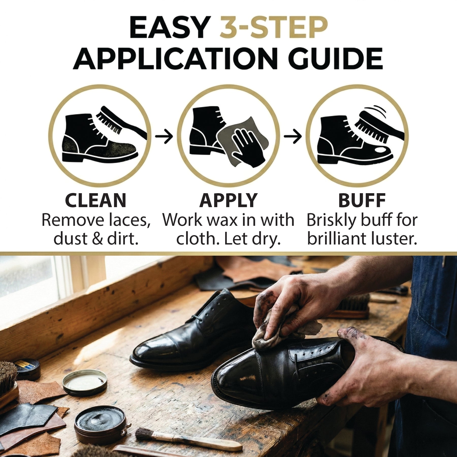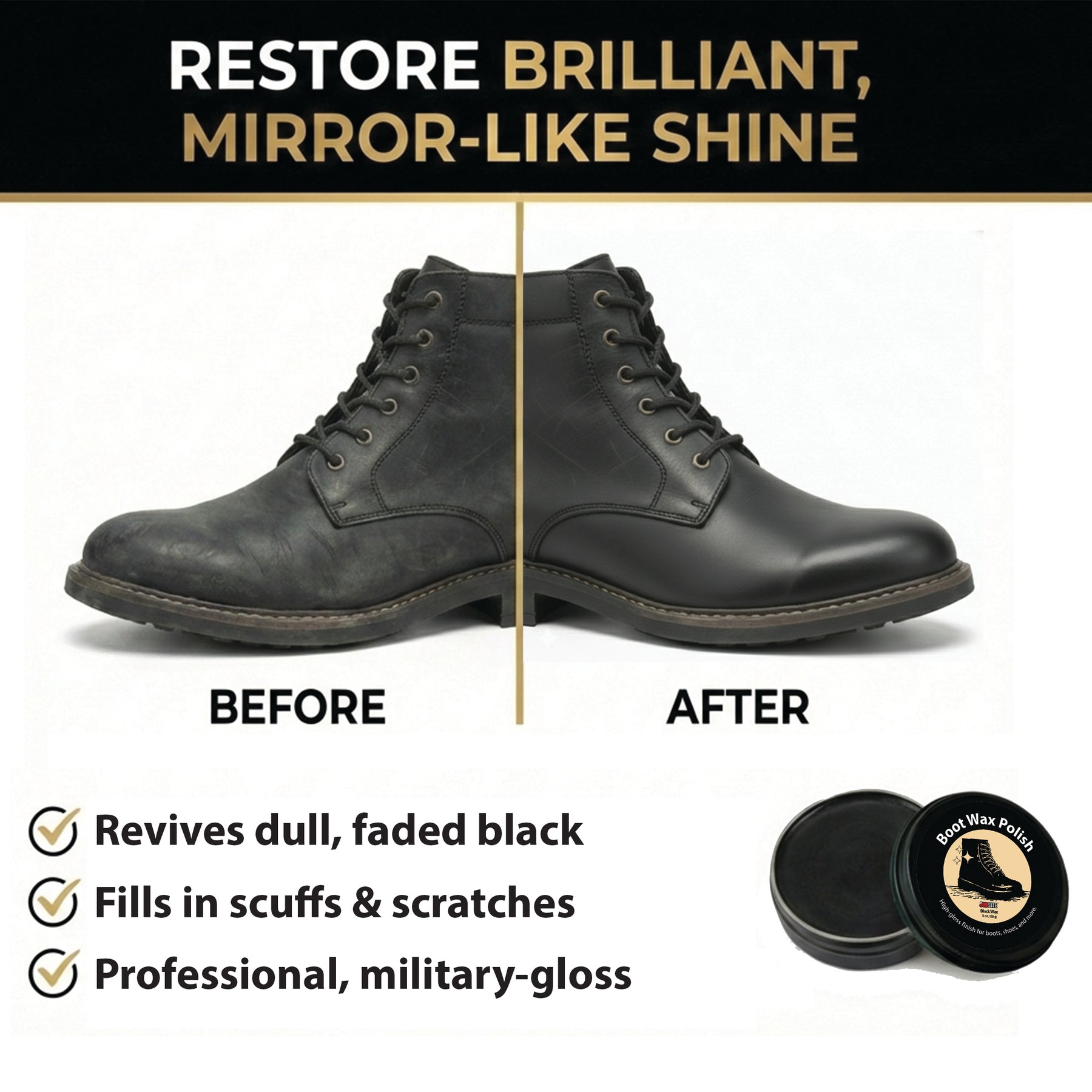 Stain Gloss High Shine Shoe Polish - Black Wax to Protect & Restore Leather Dress & Work Boots - 3 oz
